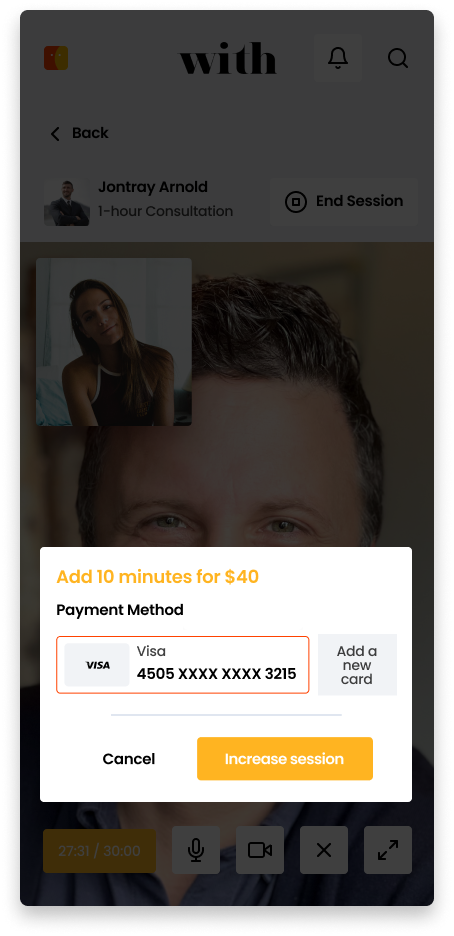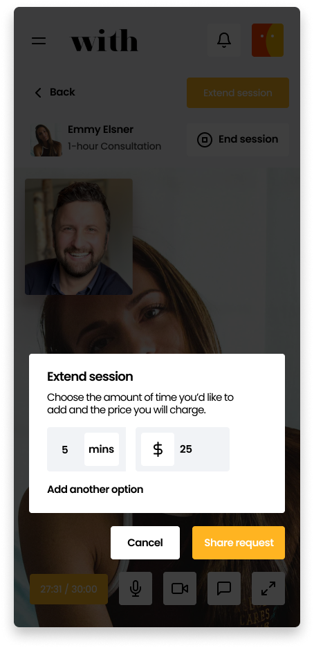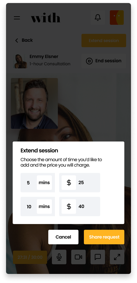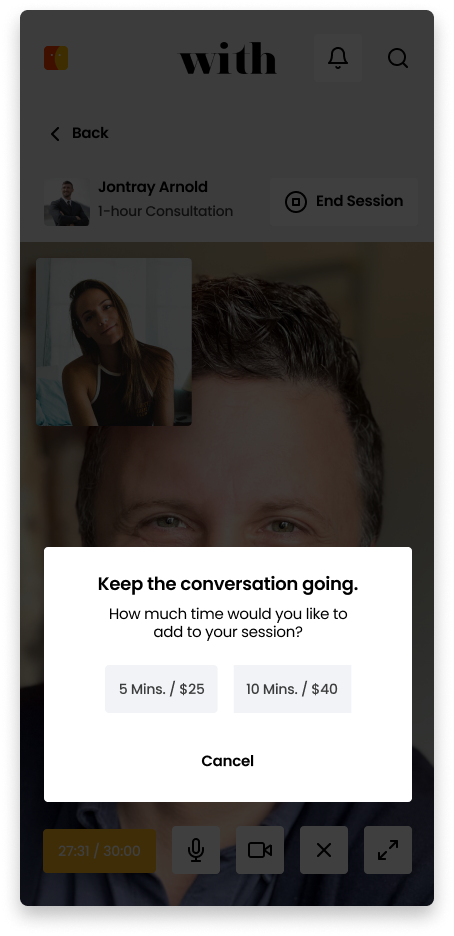 We spoke with users to determine what would be necessary if we were to develop this feature. Hosts requested the ability to discretely ask users if they would like to extend the session but didn’t want to talk about money. They wanted members to be able to request more time, but only if the host was willing to extend the session. Members agreed this would be a useful feature, and wanted the process to be as easy as possible without distracting from or taking time away from their session.