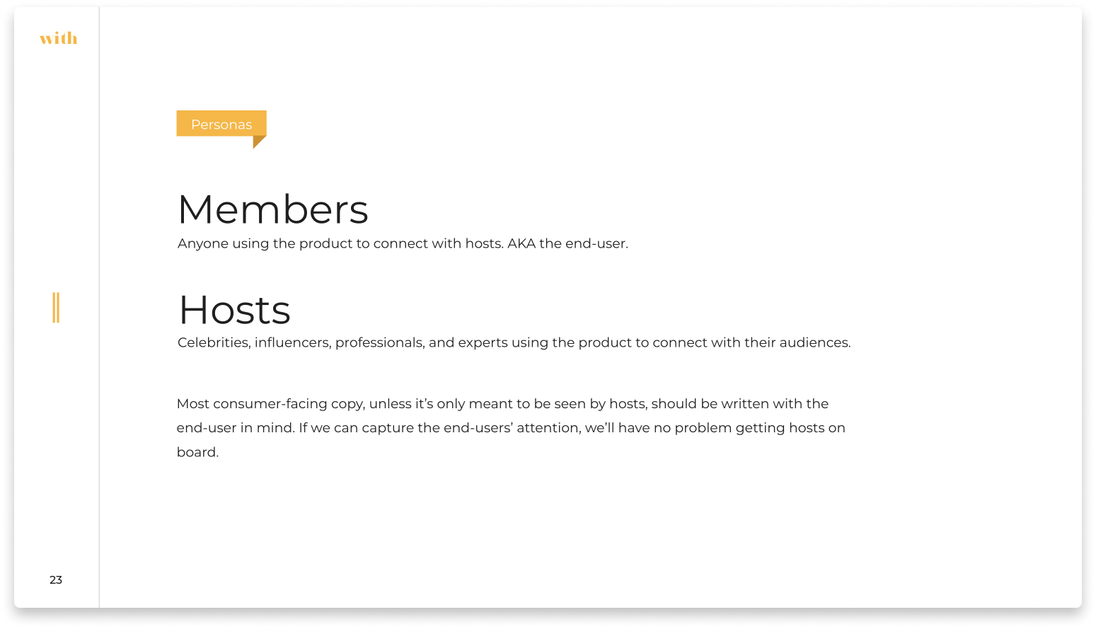 The names are now a central part of the With platform. Executive teams no longer spent hours discussing which terms they should use when referring to customers, stakeholders are no longer confused when customer groups are discussed during meetings, and users clearly understood product copy when it referred to distinct groups of users.